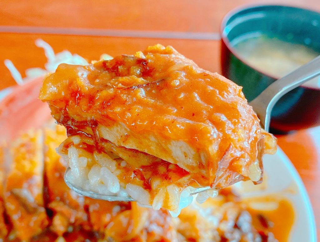 ごはんが隠れるほどのサイズのとんかつは、サクサクでジューシーな肉汁が味わえます。