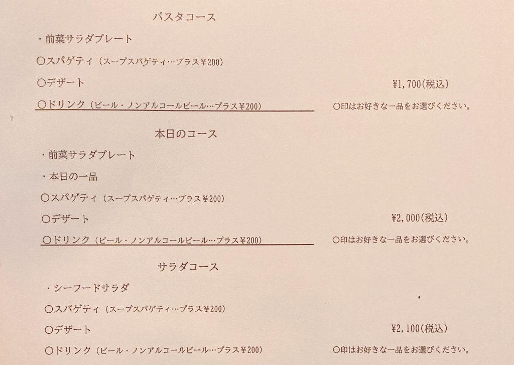 「 本日のコース 」 はパスタコースに、本日の一品が追加された充実したメニューになっています。