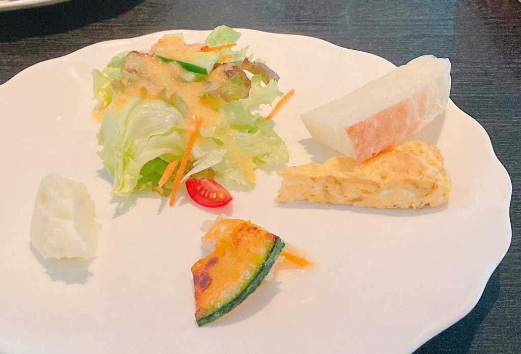 少しずつ色々な味が楽しめるパンやサラダが盛り付けられた 「 前菜サラダプレート 」 から運ばれてきます。