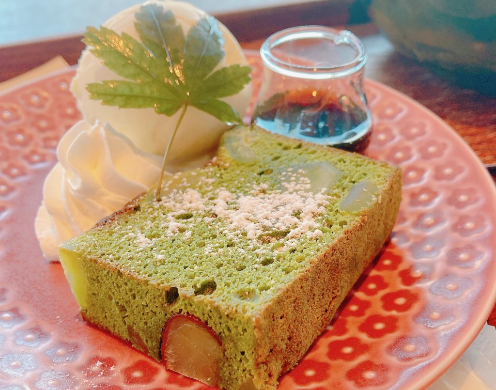 抹茶生地のパウンドケーキに栗を組み合わせたメニュー。