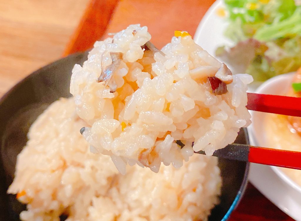 ごぼうやしいたけ、にんじんの素材の香りが楽しめる炊き込みご飯。