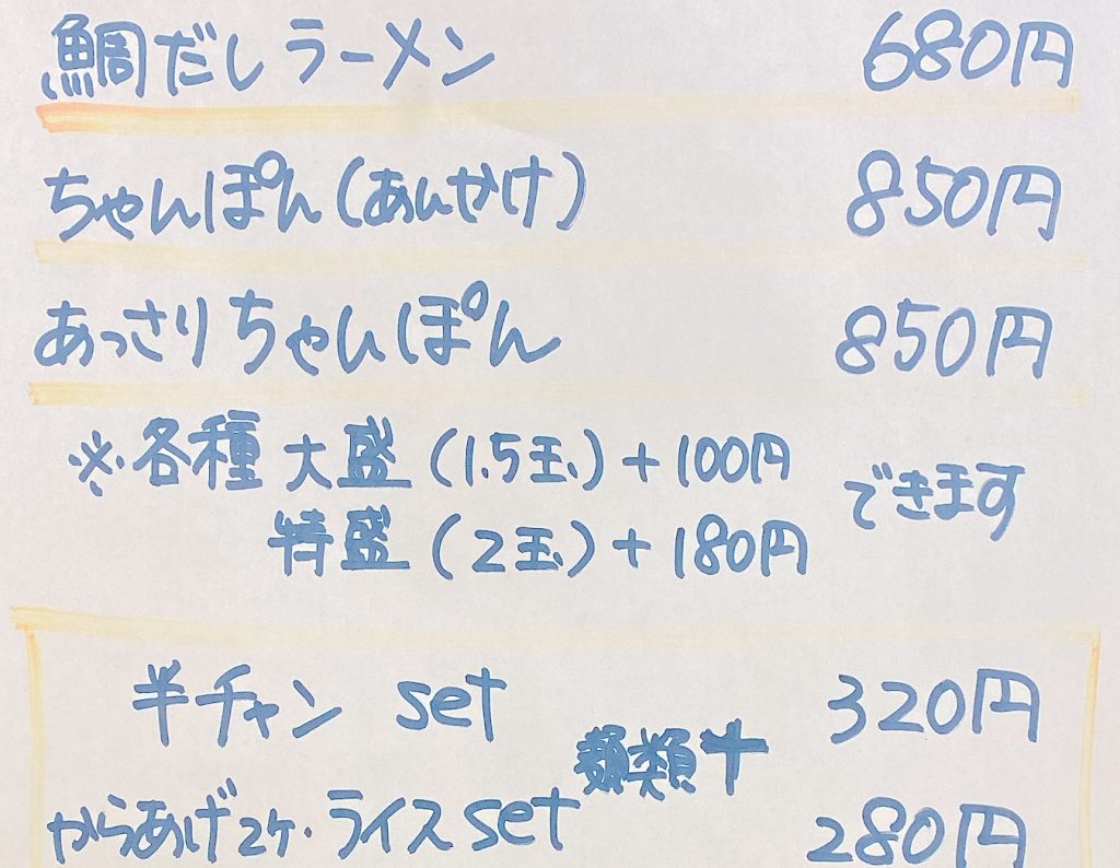 ラーメン好きな方には魚介のだしを使う 「 鯛だしラーメン 」 や 「 ちゃんぽん 」 がおすすめです。