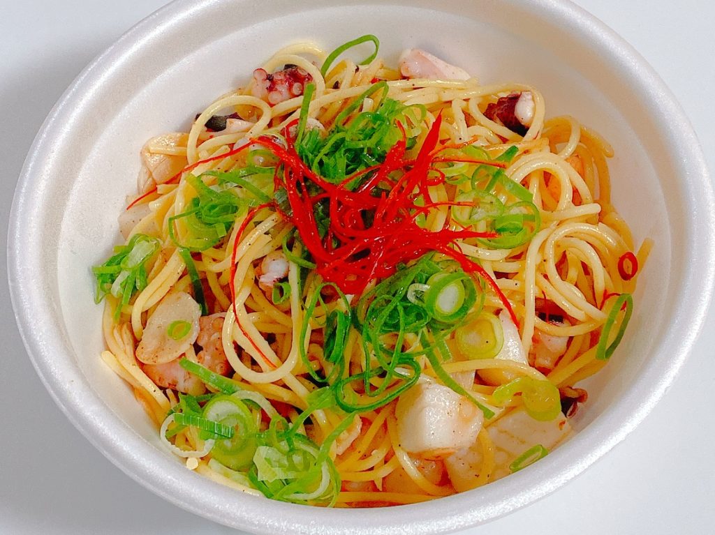 海鮮の食材とたっぷりのねぎがトッピングされたパスタ。
