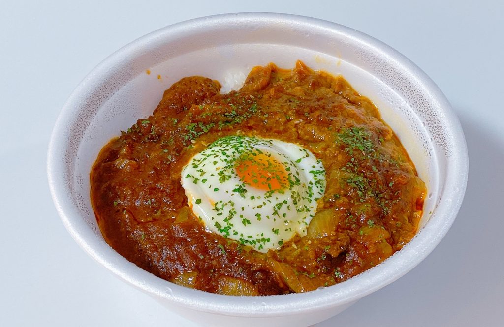 ひき肉と玉ねぎたっぷりのカレーに、半熟のたまごがトッピングされています。