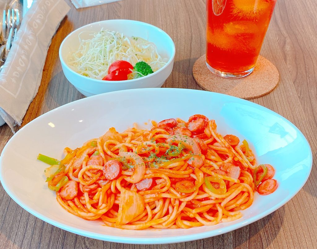 喫茶店に来ると無性に食べたくなるナポリタンとサラダ、ドリンクがセットになったランチメニュー。