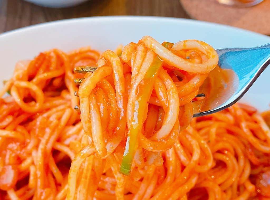 ウインナーや玉ねぎといった定番の具材が入っていて、喫茶店のシンプルな見た目のナポリタン。