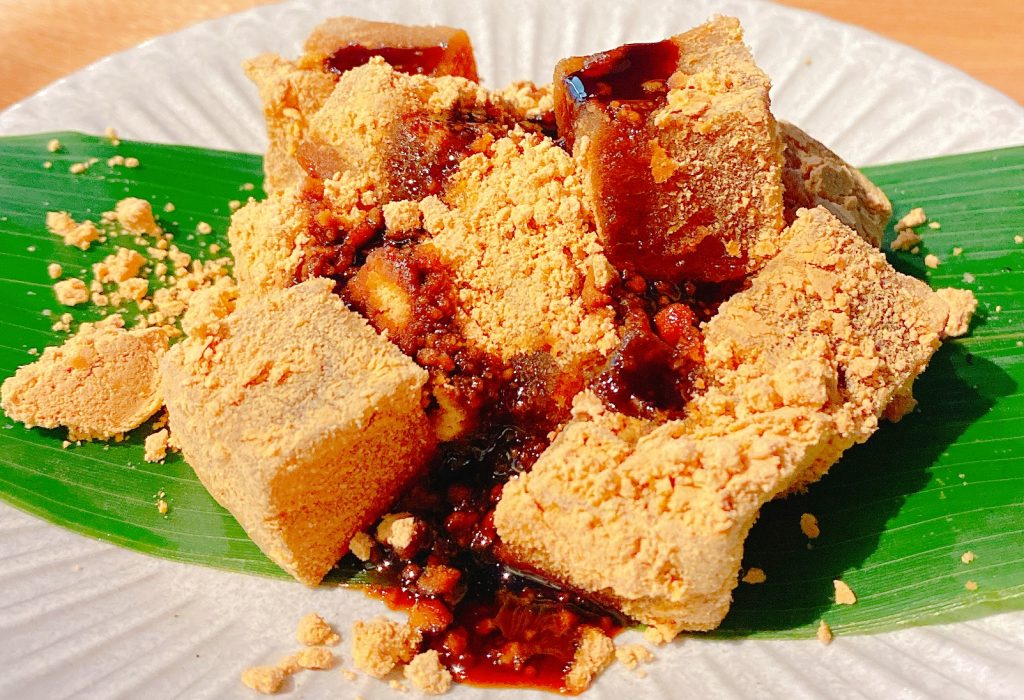 たっぷりのきな粉と黒蜜がかけられているわらびもちは、黒蜜のまろやかな甘さにきな粉の香ばしさがとてもマッチしています。