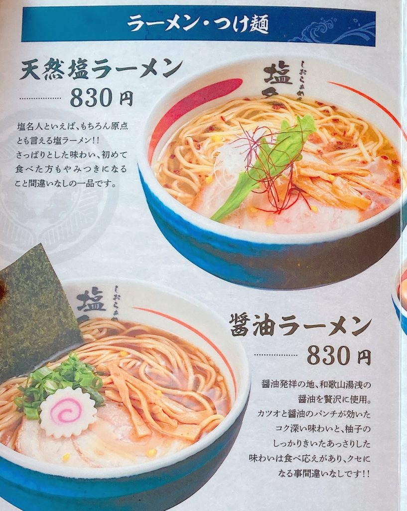 塩名人さんいちおしの 「 天然塩ラーメン 」 や女性にもおすすめできる 「 梅塩ラーメン 」 、和歌山産の醤油を使用した 「 醤油ラーメン 」 などがあります。