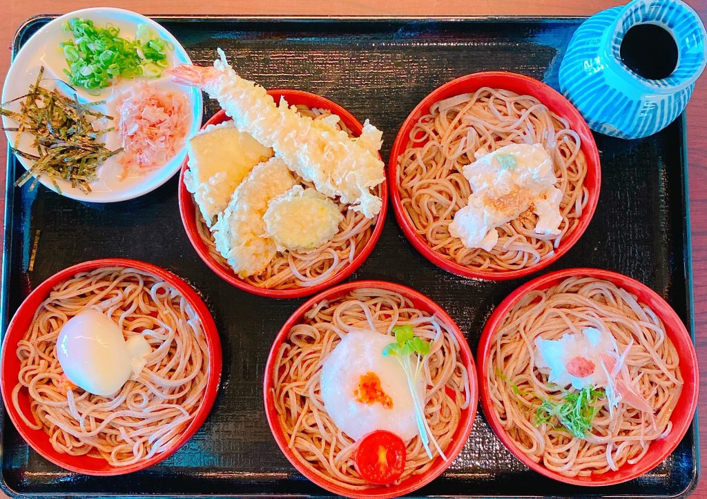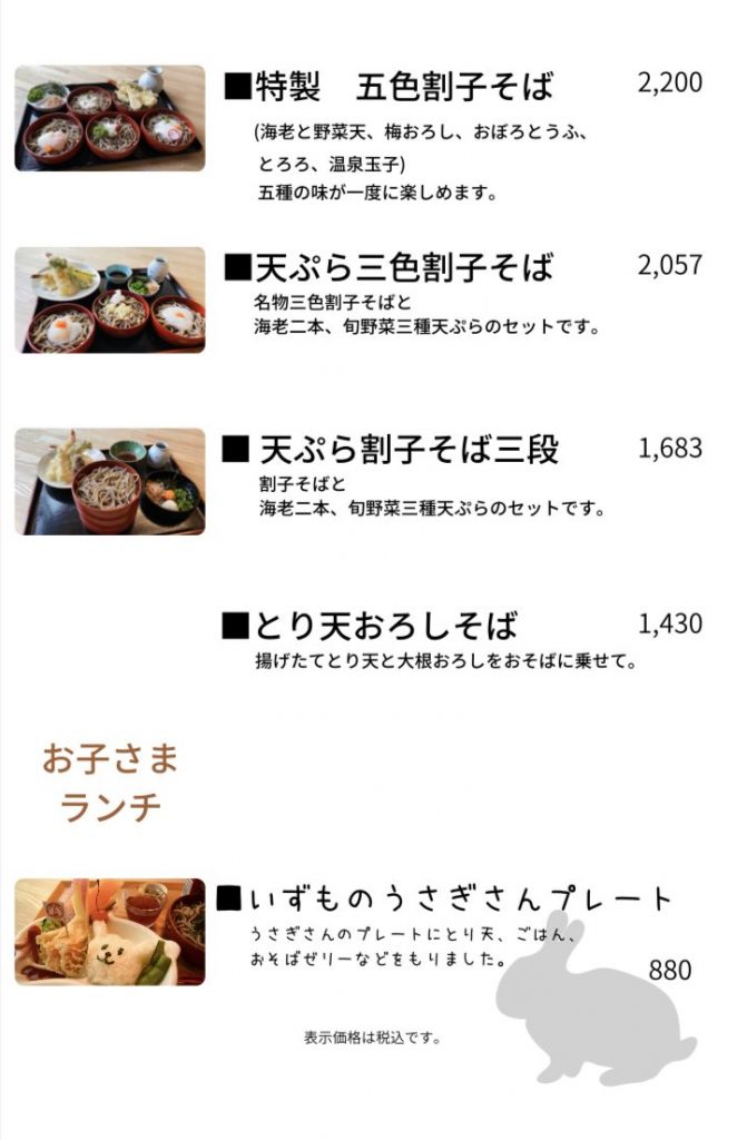 「 特製 五色割子そば 」 や 「 天ぷら三色割子そば 」 など、天ぷらと出雲そばが一緒に楽しめる豪華なメニューです。