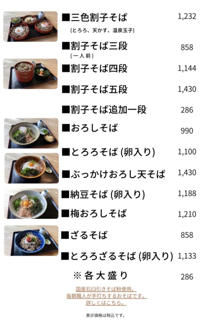スタンダードな 「 三色割子そば 」 に 「 おろしそば 」 といったメニューも。