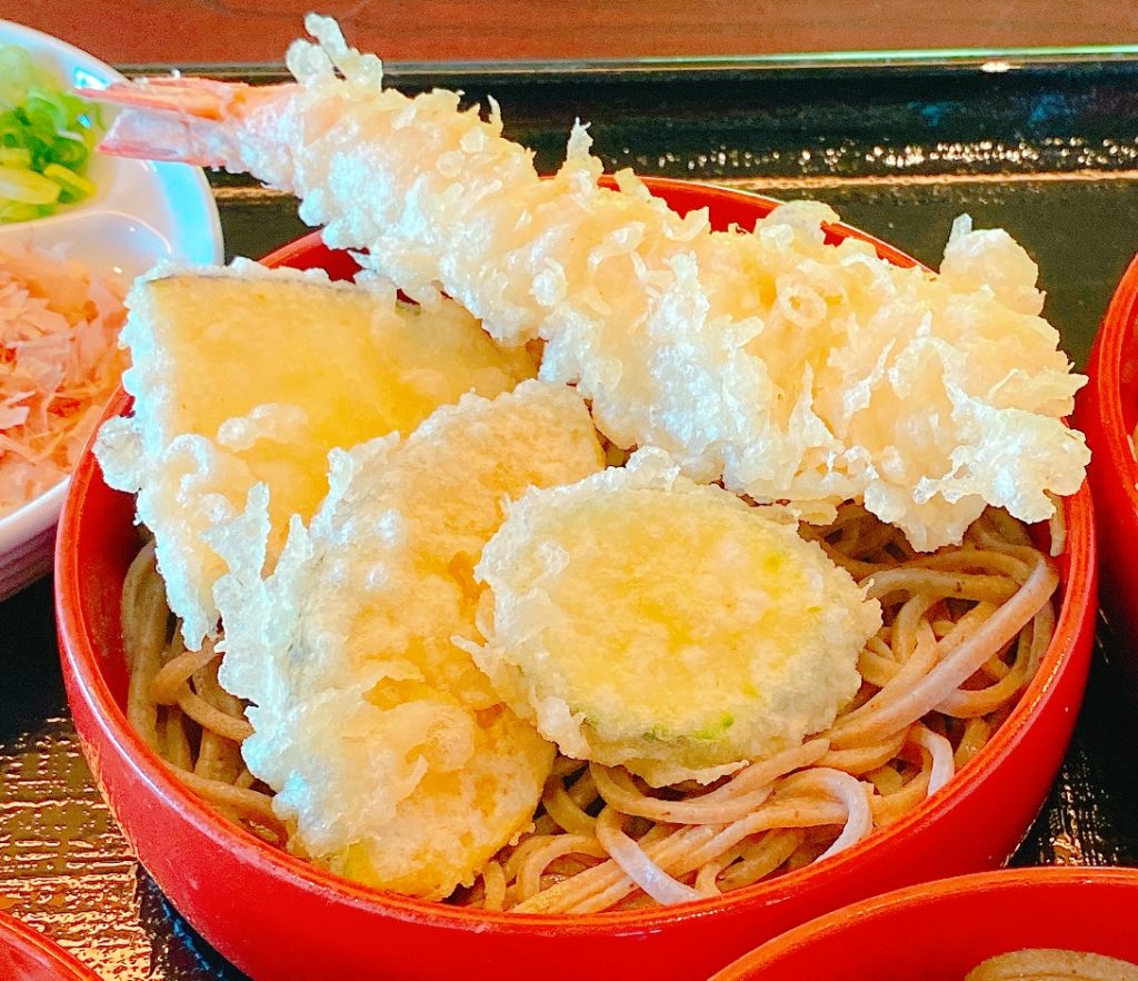 天ぷらはえびの他に、なすやかぼちゃなどの野菜天がトッピングされています。